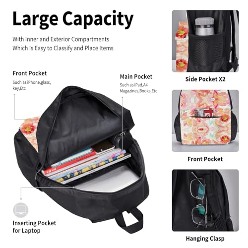 Peach Peony Print 3 Piece Set Backpack, Lunch Bag, Pencil Case, Cute Sturdy For College And Travel 7