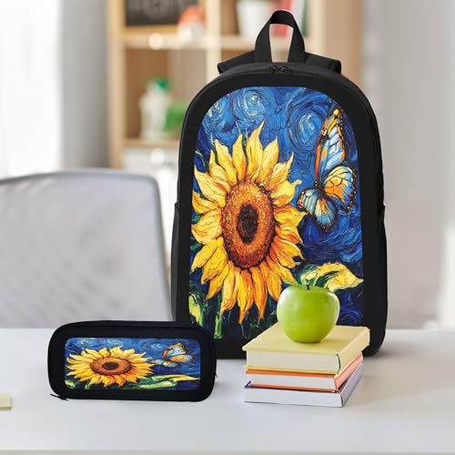 3PCS Backpack for Women Men With Lunch Box Pencil Bag 17 Inch Lightweight Adjustable Strap Back Pack 3 In 1 Set Flower Painting Sunflower Casual Daypack Unisex Fit Travel Work Camping 3