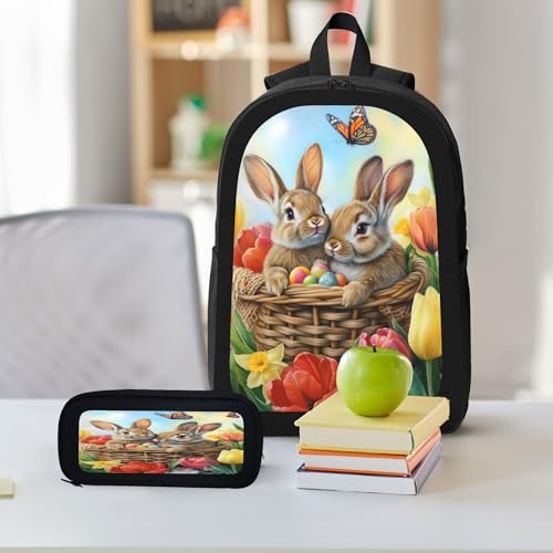 3PCS Backpack for Women Men With Lunch Box Pencil Bag 17 Inch Lightweight Adjustable Strap Back Pack 3 In 1 Set Animal Rabbit Flower Casual Daypack Unisex Fit Travel Work Camping 3