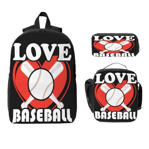 Love Baseball Bat 17 Inch Backpack Sets Lunch Bag Lightweight Daypack for Men Women 3Pcs 3