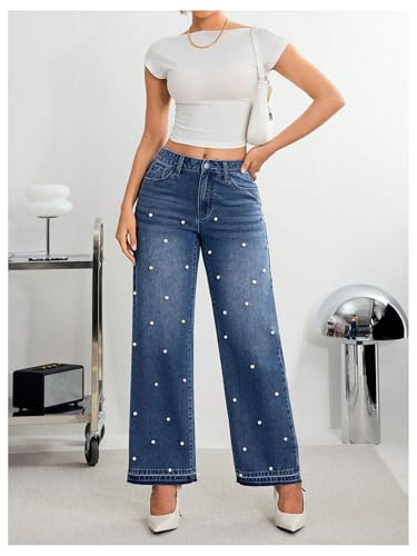 MakeMeChic Women's Pearls Jeans Cowboy Chic Outfits Wide Leg Stretch Straight Y2K Denim Pants Trousers 1