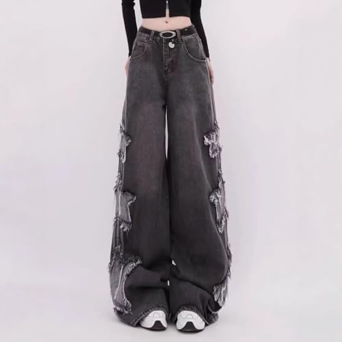 • [Feature]: Women's fashion downtown baggy jeans, star stripe patchwork breathable design,washing these black gray,wide leg,streetwear punk goth style denim pants. comfortable and breathable to wear.