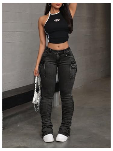 HOT ! MakeMeChic Women's Cargo Skinny Jeans Stretchy Denim Pants Y2K High Waisted Bootcut Jeans with Pockets