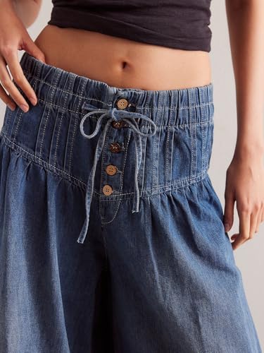 HOT ! utcoco Women's 2025 Pleated Mid-Rise Buttons Drawstring Maxi Wide Leg Jeans