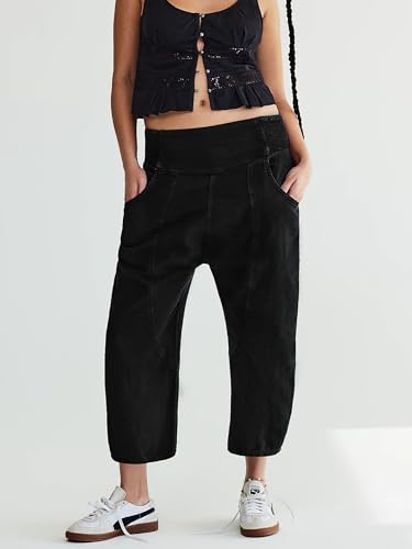 LifeShe Cropped Elastic Waist Jeans for Women Drop Crotch Jeans Low Rise Wide Leg Denim Harem Pants 1