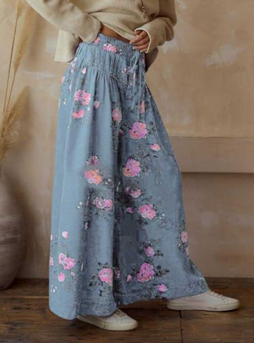 HOT ! chouyatou Women's Boho Wide Leg Floral Denim Pants Pleated Elastic Waist Drawstring Palazzo Jeans