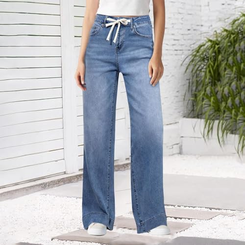 HOT ! Women's Wide Leg Jeans Trendy High Waisted Stretchy Straight Leg Baggy Jeans Drawstring Denim Pants with Pockets