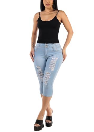 • Comfort is Key: Inspired by the sexy style of Colombian denim capris, our women's butt lifting denim capris feature a zip up 4 button closure, butt lifting design, belt loops, distressed front, rhinestone design, 2 functional front pockets, 2 functional front coin pockets and 2 functional back pockets. Rise approx 11''. Inseam is 17''. Leg opening is 11". High Waist. The wide waist on our jean capris fits right at the waist to cinch and flatten tummy.