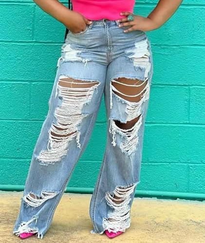 More information about Women's Trend Distressed Ripped Jeans High Waisted Cutout Straight Baggy Wide Leg Denim Pants Plus Size Long Pants