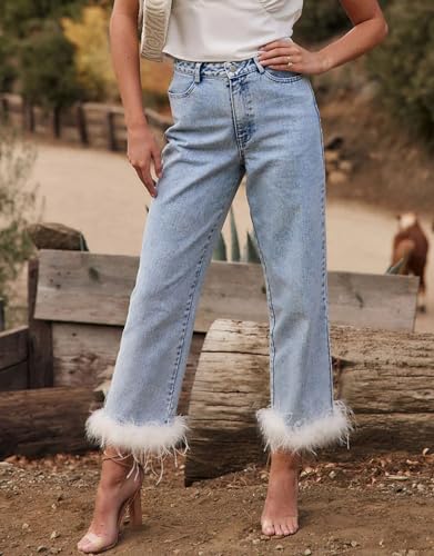 Cropped Jeans for Women Feather Trim Straight Leg High Waist Button Fly Denim Pants 4