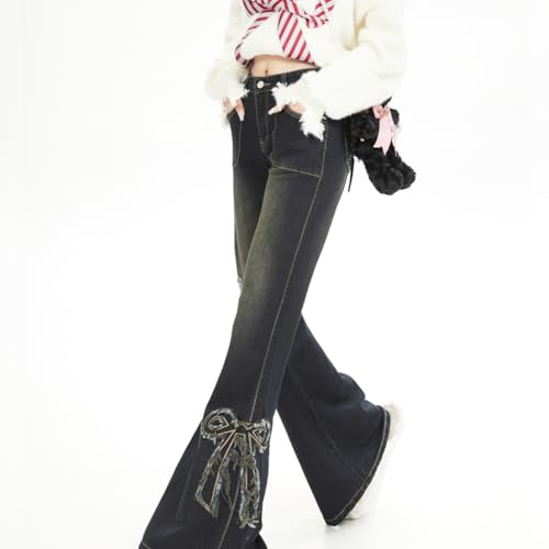 HOT ! Fashion Casual High Waisted Jeans for Women Y2K Vintage Cute Bow Tie Fringe Patchwork Bell Bottom Pants