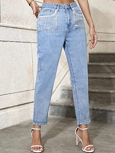 SweatyRocks Women's Casual High Rise Straight Leg Jeans Rhinestone Fringe Trim Denim Pants 6