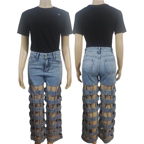 Hollow Out Jeans Women High Waisted Straight Wide Leg Trendy Cutout Ripped Party Denim Pants 4
