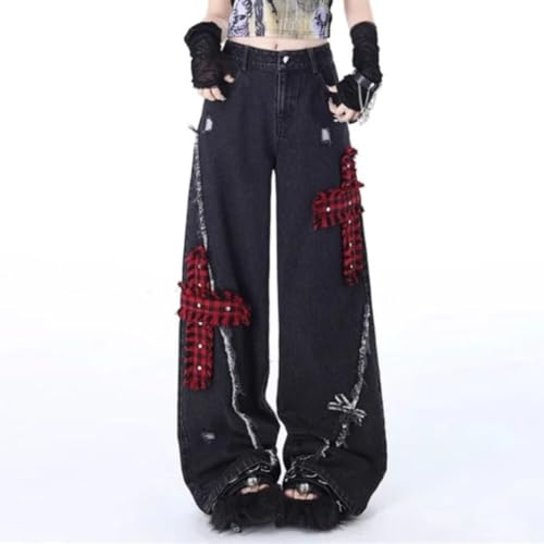 LAFOURAM Petite Jeans for Women 5 FT Short Wide Leg Baggy Cross Plaid Patchwork Denim Pants 5