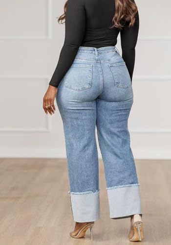 More information about YOOTIKO Women's Stretch Cuffed Jeans High Waisted Wide Straight Leg Baggy Ripped Denim Pants