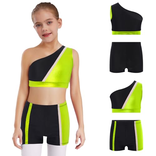 Kids Girls Shiny Metallic Color Block Sports Dance Outfit Gymnastics Vest And Shorts Bottoms Set 5