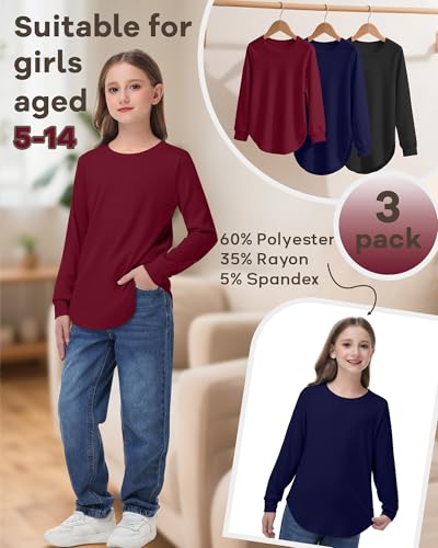 3 Pack Girls Long Sleeve T Shirts, Kids Crew Neck Casual Shirts Curve Hem Soft Tees Loose Fit Basic Tunic Tops 5