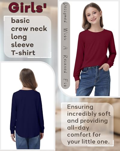 3 Pack Girls Long Sleeve T Shirts, Kids Crew Neck Casual Shirts Curve Hem Soft Tees Loose Fit Basic Tunic Tops 4