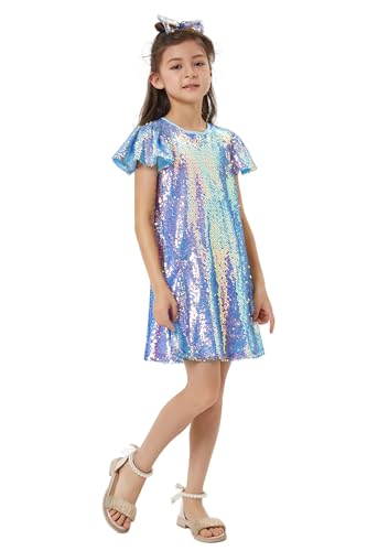 Girls Sequin Dress Shiny Short Flutter Sleeve Midi Sparkly Party Dress with Hairbow 6