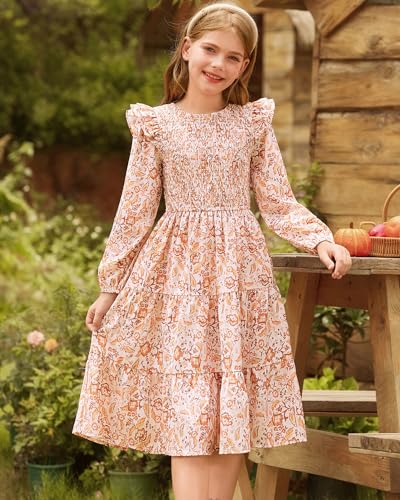HOT ! GRACE KARIN Girls Long Sleeve Fall Floral Dress Ruffle Round Neck Smocked Layered Hem