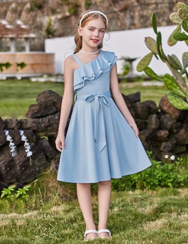 Arshiner Girls Dress One Shoulder Formal Ruffle Trim Birthday Party Dresses with Belted Pockets for 5-12 Years 1