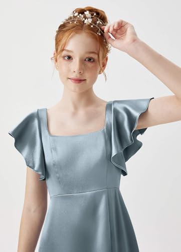 Junior Girls Bridesmaid Dress for Wedding Satin Short Sleeve Flower Girl Dresses for Teen with Slit JR002 6