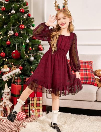 Arshiner Girls Dresses Long Sleeve Square Neck Swiss Dot Flowy Casual Party Dress 6