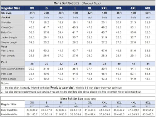 • Classic Style:Men's 3 Pieces Tux Blazer Suit, Notch Lapel 2 Buttons Blazer Jacket with Flap Pockets; 3 Buttons Double Breasted Peak Lapel Vest & Elastic Band Casual Trousers