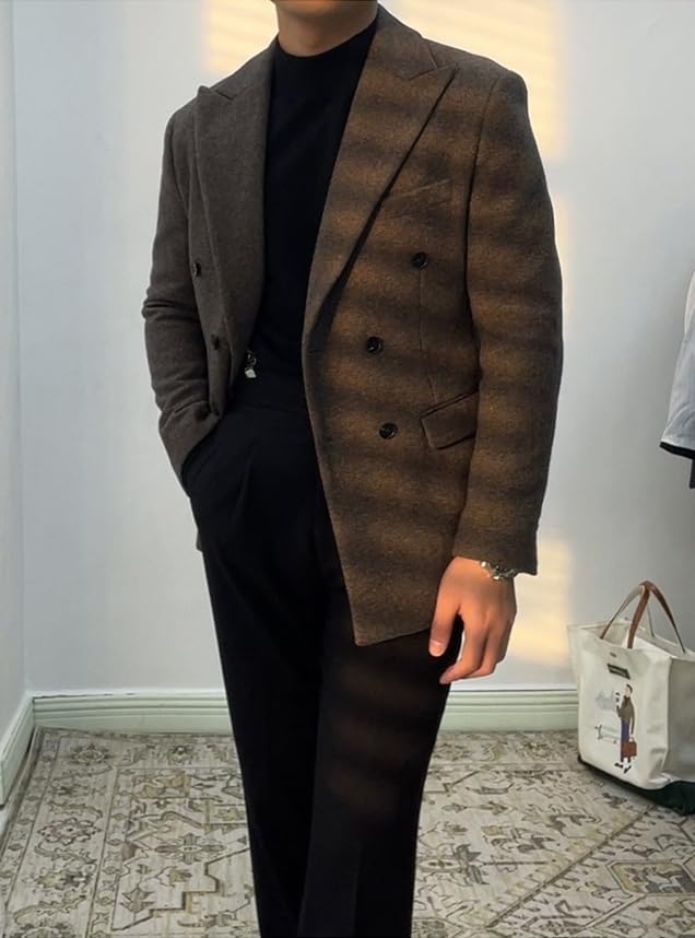Men's Tweed Blazers Vintage British Tweed Blend Jacket Double Breasted Sport Coat 1