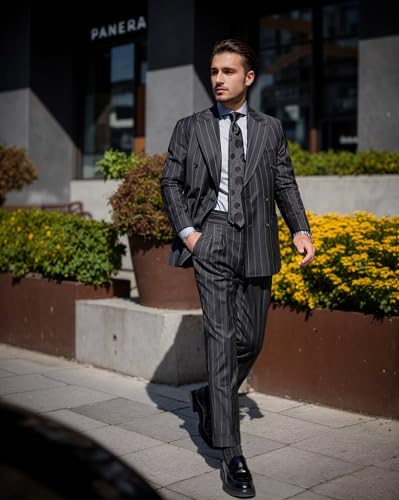 • Feature:Men's 2 Piece Pinstripe Suit; Peak Lapel Blazer Pants; Double Breasted Jacket Trousers; Flat Front Coat Pants; Regular Fit Blazer Trousers; Black Suit for Men.