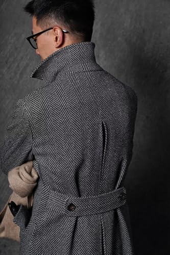 Mens Trench Coat Herringbone Tweed Pea Coat Double Breasted Peak Collar Casual Fall Winter Classic Long Overcoat 5