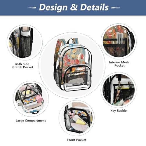 Wild Flowers Oil Painting Clear Backpack - Stadium Approved Large 15.7-inch Waterproof Transparent Bag for Sports, Concerts, Work, Travel#234 7