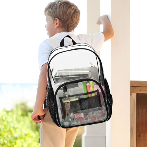 • Spacious & Organized Design – Measuring 10.6" x 5.1" x 15.7", this clear bookbag features a large main compartment for magazines/books, a front mesh pocket for pens/pencil cases, and two side mesh pockets for water bottles or umbrellas—keeping essentials secure and visible.