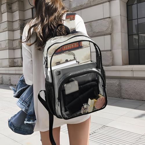 Kids PVC Clear Backpack Steam Train Red Black Heavy Duty Multi-pockets Large Capacity Transparent See Through Bookbag for School Travel Sport Work 1