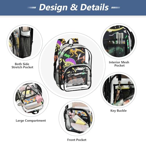 • Size: Measuring 10.6 x 7 x 15.7 inches,Our Clear Backpack For School includes a main compartment, a medium front compartment features with mesh slots and key buckle for small items. Plus, the see through backpack offers two side mesh pockets for water bottles or umbrellas.