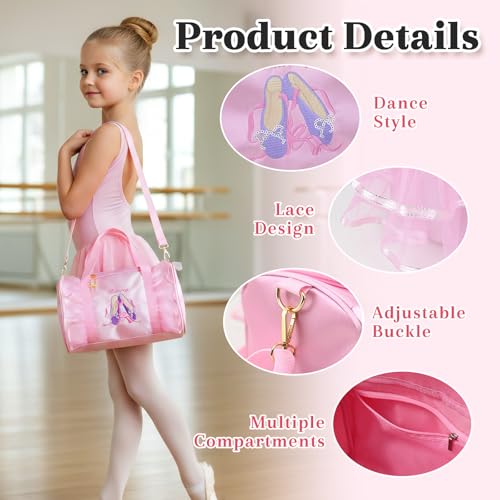 • Cute Dance Bag: Fashionable ballerina pattern and cute lace dance bag for girls. The lace ballerinas are embroidered and decorated with lace, and the portable name tag allows you to write your name easily, and the portable adjustable buckle can be adjusted according to your needs. Pink plush poms add a pop of color to the bag.
