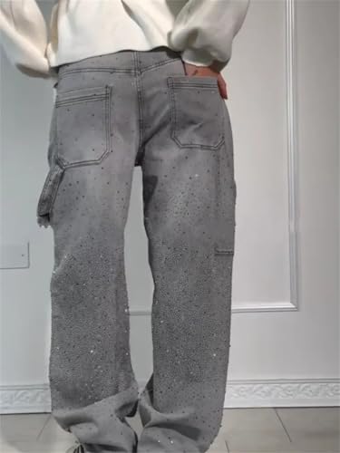 Women's Casual Rhinestone Loose Jeans, High Waisted Rhinestone Jeans for Women, Boyfriend Baggy Wide Straight Leg Denim Pants 6
