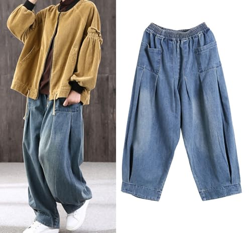 HOT ! loveimgs Women Pleated Wide Leg Denim Pants Baggy Boyfriend Barrel Jeans Elastic Waist Balloon Harem Pants Y2k