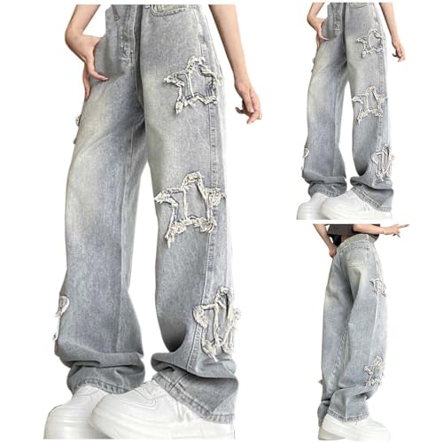HOT ! Womens Baggy Jeans Trendy Y2K Star Embroidered Boyfriend Denim Pants High Waisted Wide Leg Trousers with Pockets