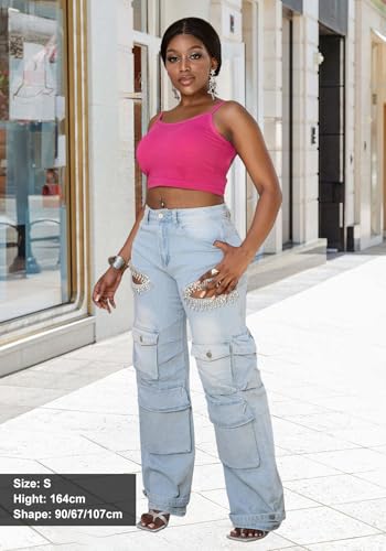 More information about DINGANG Women's High Waisted Cargo Jeans Rhinestones Bling Stretchy Baggy Denim Pants with Flap Pockets