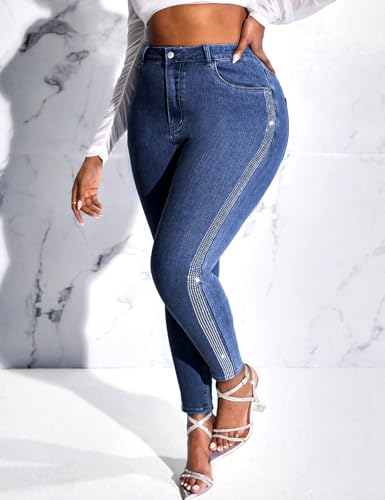 More information about Womens High Waisted Stretch Skinny Jean Plus Size Side Rhinestone Denim Pants