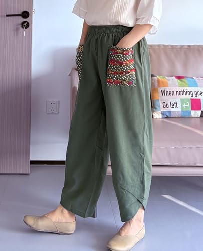 Minibee Women's Baggy Linen Wide Leg Trousers Casual Patchwork Elastic Waist Harem Pants 6