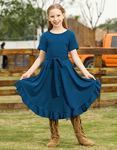 KYMIDY Girls Short Sleeve Swing Dress Kids Ruffle Loose Casual Twirl Belted Dresses with Pockets for Girls 6-12 Years 1