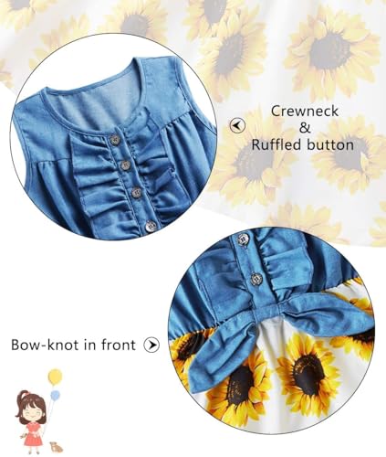 • The feature of girls denim dress: kids sundress with sunflower/lemon/mermaid/leopard/unicorn/rose flower print;Ruffled button bow-knot and printed elastic waist design;Sleevelss style make it easier for the baby to wear and remove.