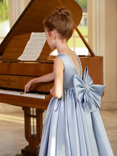 • 🌱 Exquisite Design:This girl's satin flower girl wedding dress features elegant v-back with pealrs and bow,sleevelss,crew neck design to creat charming holiday birthday evening party prom dres.Floor length puffy a-line design creating a flowing and elegant look that will keep your girl pretty and elegant in all seaso