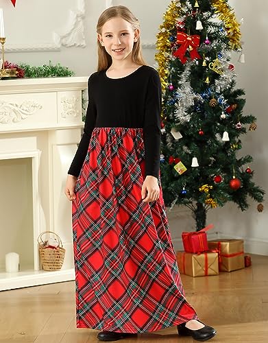 KYMIDY Girls Maxi Dress Kids Buffalo Check Plaid Long Sleeve Casual Dresses with Pockets for Girls 6-14 Years 6