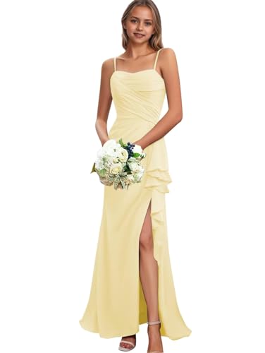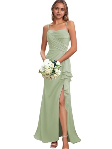• Features:Spaghetti straps junior bridesmaid dress for teen girls,chiffon flower girl dress for wedding,ruffle girls formal dress,side slit wedding party pageant gowns,floor length,lace up back.This dress will make your little girl the centre of attention.