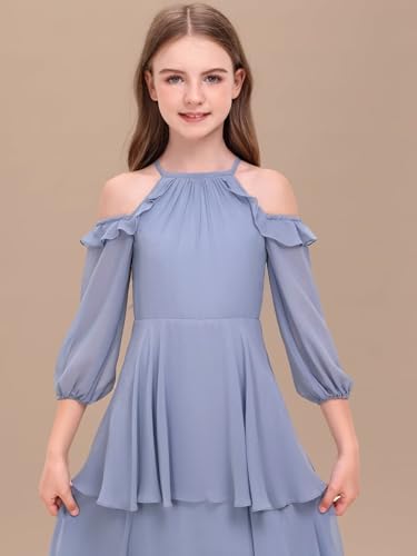 Chiffon Junior Bridesmaid Dress Tiered Halter Cold Shoulder Sleeve Long A-Line Princess Pageant Flower Girl Dress 5
