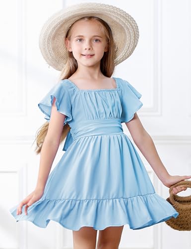 Durio Girls Summer Short Sleeve Dress Tie Back Off Shoulder Dresses for Teens Ruffle Tween Girls Dresses Size 6-16 Years 4