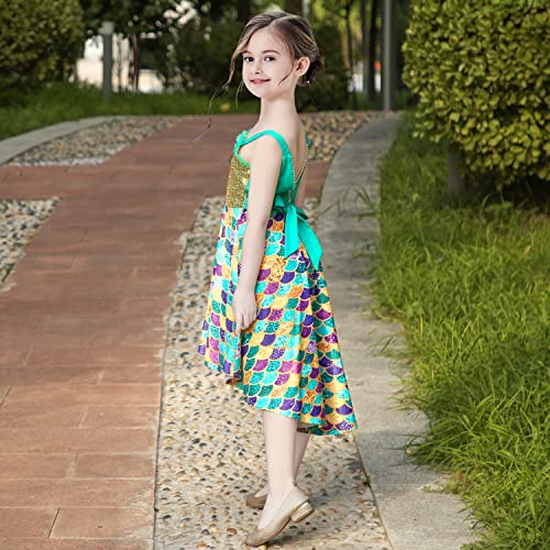 • Super attractive girls dress for mermaid pretending party. Shiny gold sequin bodice and colorful fish scale high low skirt, capture your eyes on first sight, pearl decorated backless design brings more surprise. Perfect for summer days, beach party, event, trick or treat, performance and daily life. Following size means age ranges for girls, they are for general guidance only. For most accurate fit, we recommend checking detailed measurement before purchase.